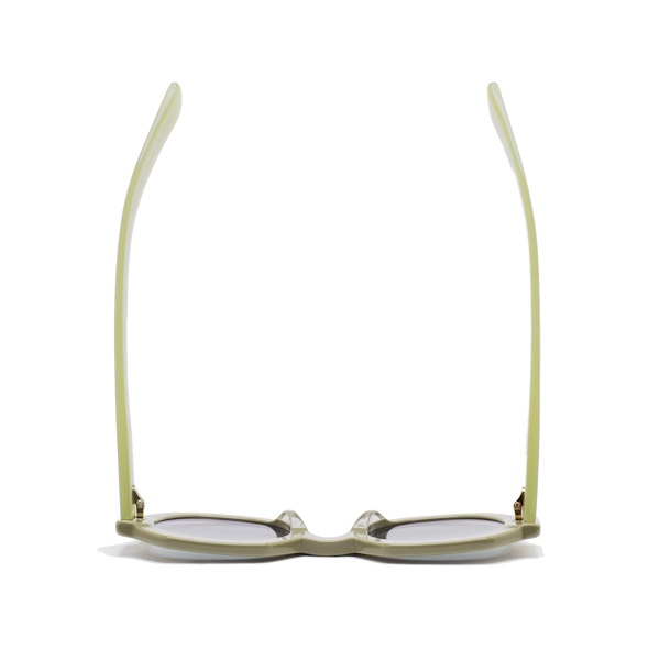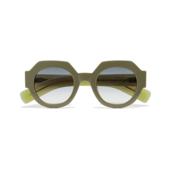 Kaleos Tatlock es una gafa de sol de forma redondeada. Frontal y varillas de acetato verde. Lente gris degradada base 2 con 100% protección UV y tratamiento antirreflejante. Lente Categoría 3. Plaquetas de acetato incorporadas. Hecha a mano.