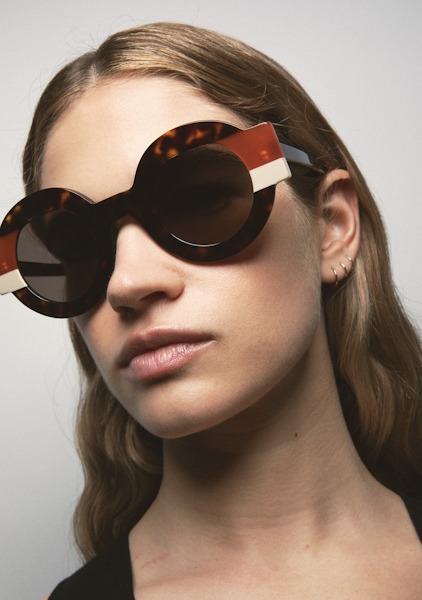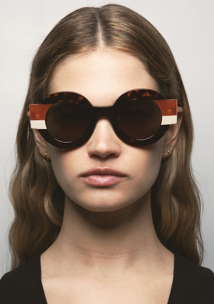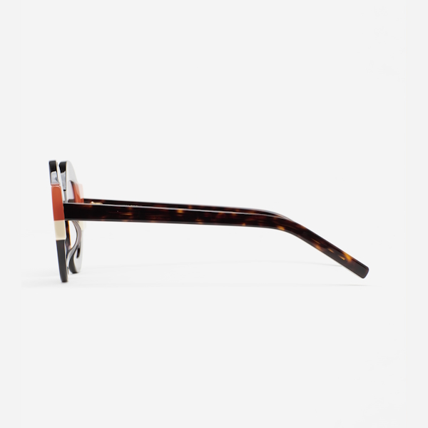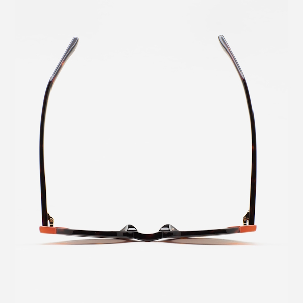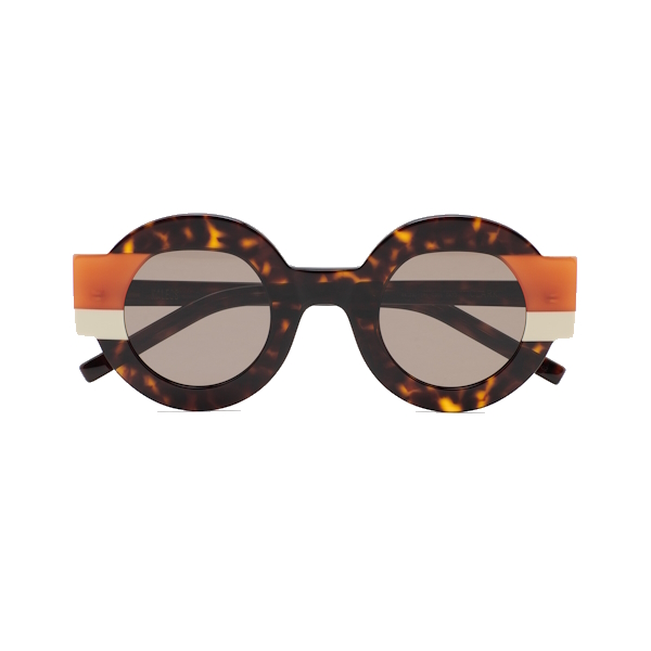 Kaleos Clark es una gafa de sol de forma redondeada con un diseño que destaca por el talón pronunciado y de distinto color del frente de la gafa. Frontal de acetato havana marrón oscuro con doble laminado naranja translúcido y beige. Varillas de acetato havana marrón oscuro. Lente gris base 2 con 100% protección UV y tratamiento antirreflejante. Lente Categoría 3. Plaquetas de acetato incorporadas. Hecha a mano.